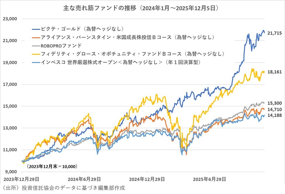 パフォーマンスの点では、ランキングを駆け上がっている「ROBOPROファンド」の成績が2023年12月末を起点とすると2025年12月5日時点で「アライアンス・バーンスタイン・米国成長株投信 Bコース(為替ヘッジなし)」や「インベスコ 世界厳選株式オープン<為替ヘッジなし>(1年決算型)」という代表的な大規模株式アクティブファンドの成績を上回っていることが注目される。「ROBOPROファンド」は世界の取引所に上場するETFに投資することを通じて株式、債券、リートに加えコモディティ(純金など)に投資する。マーケットデータ等分析に加えて対象資産のリスク相関性の分析などを機械学習によって計算し、最適な配分比率を導き出す。原則として1カ月ごとに配分比率の変更を行っている。