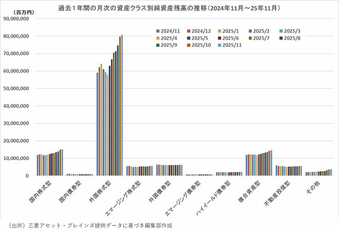 三菱アセット・ブレインズがまとめた2025年11月の公募ファンドの純資産残高は約135兆4506億円で前月比約1兆8039億円増加した。純資産残高は7カ月連続で増加し、前月に続いて史上最大を更新した。純資産残高の増加額は前月の約7兆7591億円から大幅に減少した。「外国株式型」は増加額が約1兆238億円と前月の約5兆597億円から大幅に減少。また、「複合資産型」も約4341億円(同約5980億円)、「その他」が約1606億円(同3974億円)、「国内株式型」が約1592億円(前月は約1兆1459億円)の増加だった。一方、「外国債券型」は約702億円(前月は1062億円の増加)の減少、「エマージング株式型」も約386億円(同約3185億円増加)の減少と、前月の増加から一転して減額となった。「国内債券型」は約46億円の減額と2024年9月以来15カ月連続の残高減少が続いている。