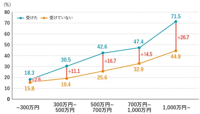 例えば、職場での金融教育経験がある人は、そうでない人に比べて、報酬満足度が高い人の割合が1.7倍に増えています【図表2-1】。両者の差は、年収が上がるほど顕著に広がっていることが分かりました【図表2-2】。