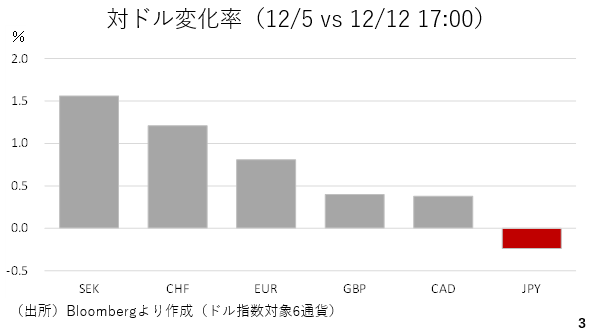 日銀は、2024年も能登半島沖での地震を受け、1月とみられたマイナス金利解除が3月に先送りされました。市場はそれを連想したと考えられます。一方、週半ば以降はドル指数が低下しており、FOMC後にドル安が進んだことがわかります(スライド2)。