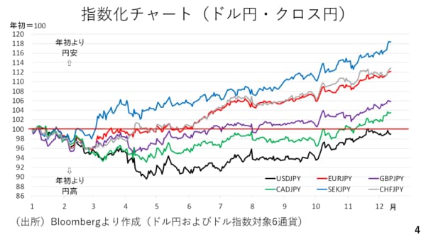 実際、年初を100として指数化したチャートによれば、今週もスウェーデンクローナ円が堅調に推移したほか、ユーロ円やスイスフラン円は依然として史上最高値圏です。ドル円のみ年初の水準にあと1%程度、届いていませんが総じて円安傾向が続いていることがわかります(スライド4)。
