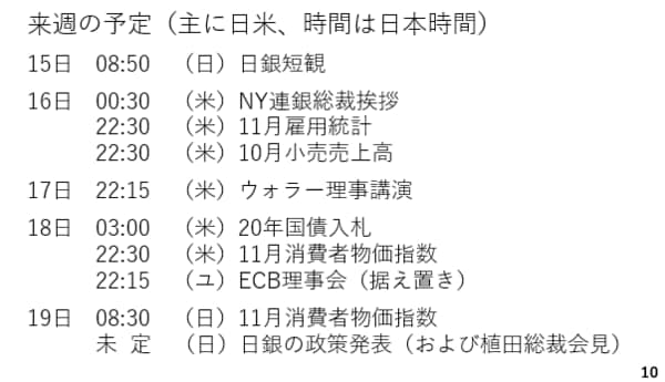 来週はアメリカの雇用統計と日銀の金融政策決定会合が注目されます。なお、ECB理事会では政策金利は据え置かれるでしょう(スライド10)。