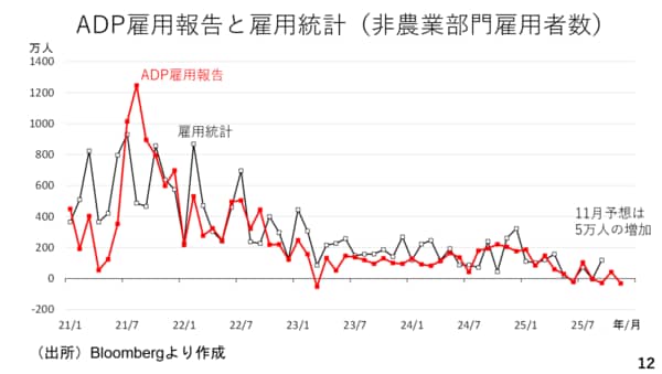 では、最後にアメリカの雇用統計の動きを見ておきましょう。ADP雇用報告によれば11月はマイナスを記録したほか、過去6カ月間で4度のマイナスを記録しています。雇用統計は10月分の未公表が確定しており、来週のデータは9月から1ヵ月空いた11月分です。現在の市場予想が5万人程度の増加を見込んでいるだけにマイナスとなった場合のドル安に要注意です(スライド12)。