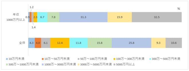 また平均保有額は約3300万円。2位の年収700万~1000万円(約2210万円)とは1000万円以上の差をつけ、全体平均(約1720万円)の2倍近くに達するなど、規格外の大きさだ。老後に公的年金だけでは多額の資金が不足すると金融庁の報告書で指摘されて話題になった「老後2000万円問題」がある。しかし年収1000万円以上ともなると半数程度は既に金融資産でこの「2000万円」をクリアしている。