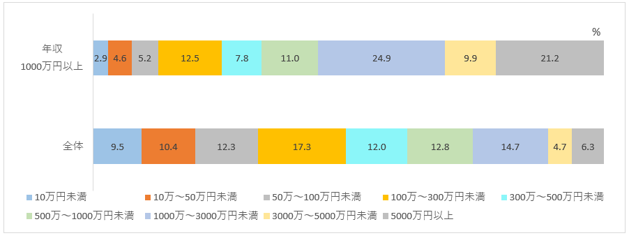 一方で3位には「100万~300万円未満」がランクイン。年収からするとかなり少ないが、年収1000万円になりたての若い人なのか、それとも有価証券をあまり持たないポリシーがあるのか、気になる結果だ。