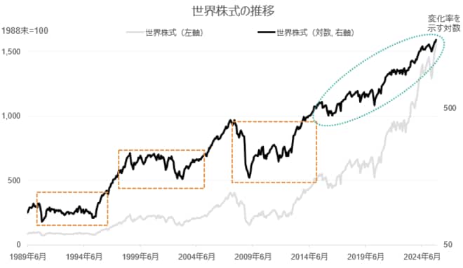 図表2は長期の世界の株式市場の推移を示しています。灰色のグラフのように単純に市場の推移を示すと過去の変化が小さく示されるため、黒色のグラフは対数を用いてどの時点でもその変化率が比較できるようにしています。これをご覧になると、過去は比較的長い期間にわたり伸び悩む時期を何度も経験していますが、最近はそういったことがしばらく生じていないことがわかります。