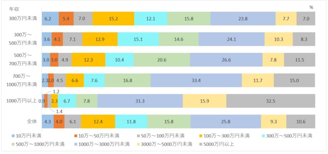 まず年収300万円未満。最多回答の金額も全体より小さいと思いきや、結果は「1000万~3000万円未満」が1位。割合も23.8%と全体(25.8%)に比べてほぼ遜色ない水準だ。さらに2位と3位も全体と同じく「500万~1000万円未満」「100万~300万円未満」と続く。意外に上位は全体と変わらないのだ。以降の年収300万~500万円未満、年収500万~700万円未満、年収700万~1000万円未満でも最多回答は「1000万~3000万円未満」を踏襲している。