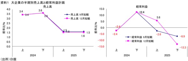 資料1は、12月短観の調査対象大企業(全産業、除く金融)が計画する半期別売上高・経常利益前年比の推移を見たものである。まず売上高を見ると、25年度は年度全体で下方修正となっている。