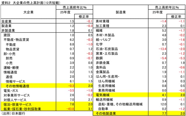 売上高上方修正の「鉱・採石・砂利採取」「その他製造」「宿泊・飲食サービス」