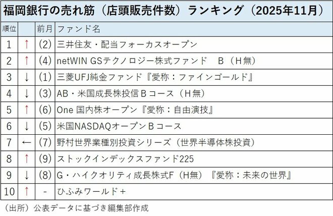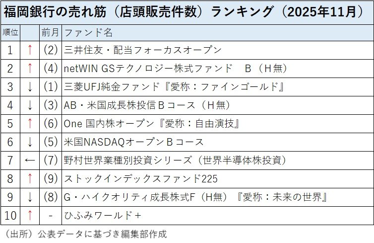 福岡銀行の売れ筋(店頭販売件数ランキング)の2025年11月は、前月第2位だった「三井住友・配当フォーカスオープン」(設定は三井住友DSアセットマネジメント)がトップに返り咲いた。前月トップだった「三菱UFJ純金ファンド(愛称:ファインゴールド)」(三菱UFJアセットマネジメント)は第3位に後退し、前月第4位だった「netWIN GSテクノロジー株式ファンド B(H無)」(ゴールドマン・サックス・アセット・マネジメント)が第2位に上がった。また、「One 国内株オープン(愛称:自由演技)」(アセットマネジメントOne)が前月第6位から第5位に、「ストックインデックスファンド225」(大和アセットマネジメント)が前月第9位から第8位に上がるなど、国内株ファンドの上昇が目立った。