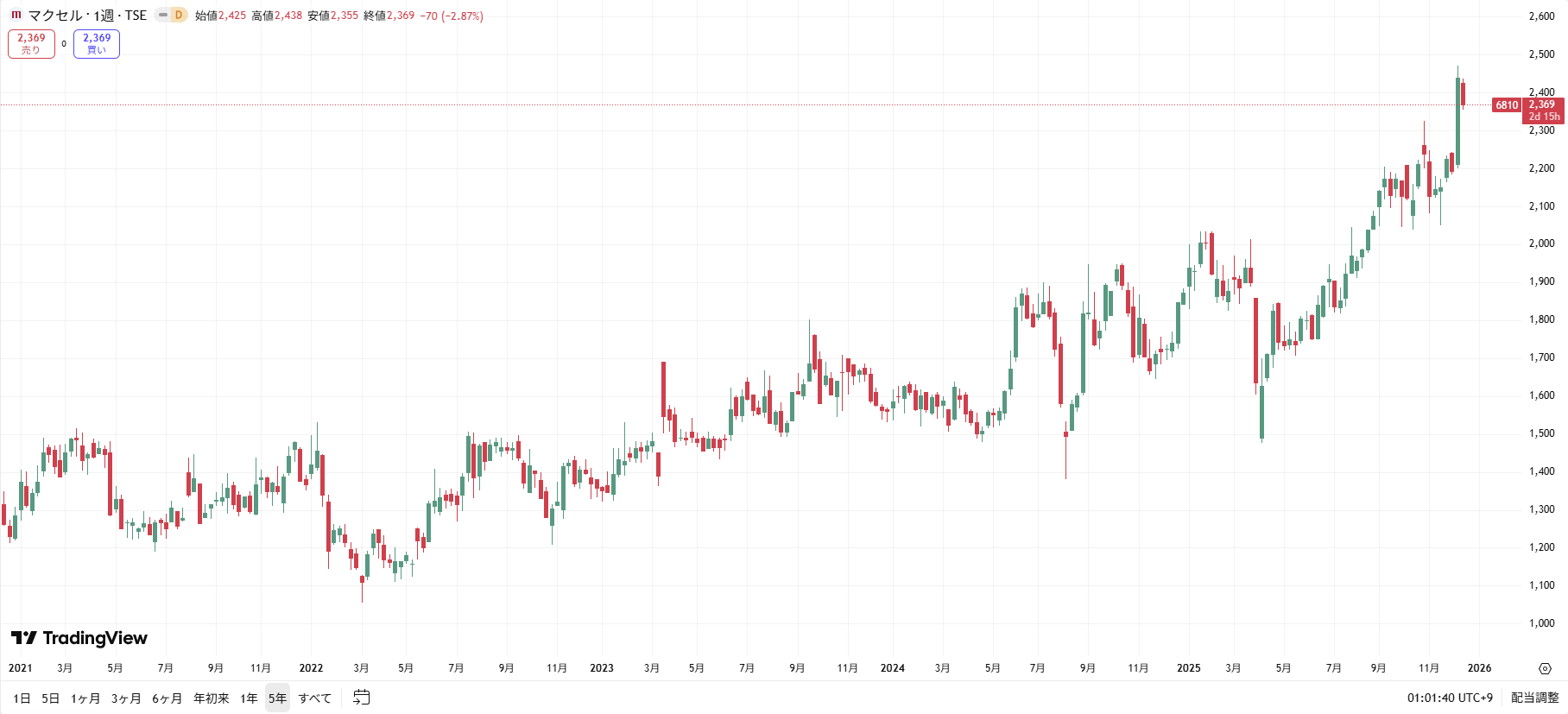 マクセル(旧・日立マクセル)の株価が上げ足を早めています。株価は2022年以降から緩やかな上昇トレンドを描いており、特に25年4月のトランプ関税ショックからは値上がりが顕著です。25年12月には、国内の大手証券会社が目標株価を引き上げたことが伝わり、株価は2471円の年初来高値まで上昇しました。