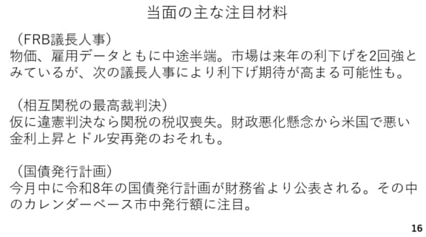3つ目は日本の令和8年度の国債発行計画です。年内に公表される見通しですが、安定消化に資する内容となっているか、確認する必要があります(スライド16)。