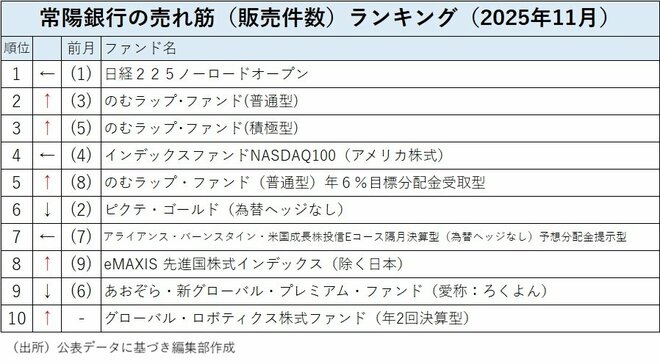 常陽銀行の投信売れ筋ランキング(販売件数)の2025年11月のトップは前月と同じ「日経225ノーロードオープン」(設定はアセットマネジメントOne)だった。第2位には前月は第3位だった「のむラップ・ファンド(普通型)」(野村アセットマネジメント)が上がり、第3位には前月第5位だった「のむラップ・ファンド(積極型)」が上がった。「インデックスファンドNASDAQ100」(アモーヴァ・アセットマネジメント)は4位をキープした。前月第2位だった「ピクテ・ゴールド(為替ヘッジなし)」(ピクテ・ジャパン)は第6位に下がった。前月の第8位から第5位に順位を上げた「のむラップ・ファンド(普通型)年6%目標分配金受取型」(野村アセット)など、売れ筋トップ10の中に「のむラップ・ファンド」が3本ランクインし、3本ともに順位を上げた。