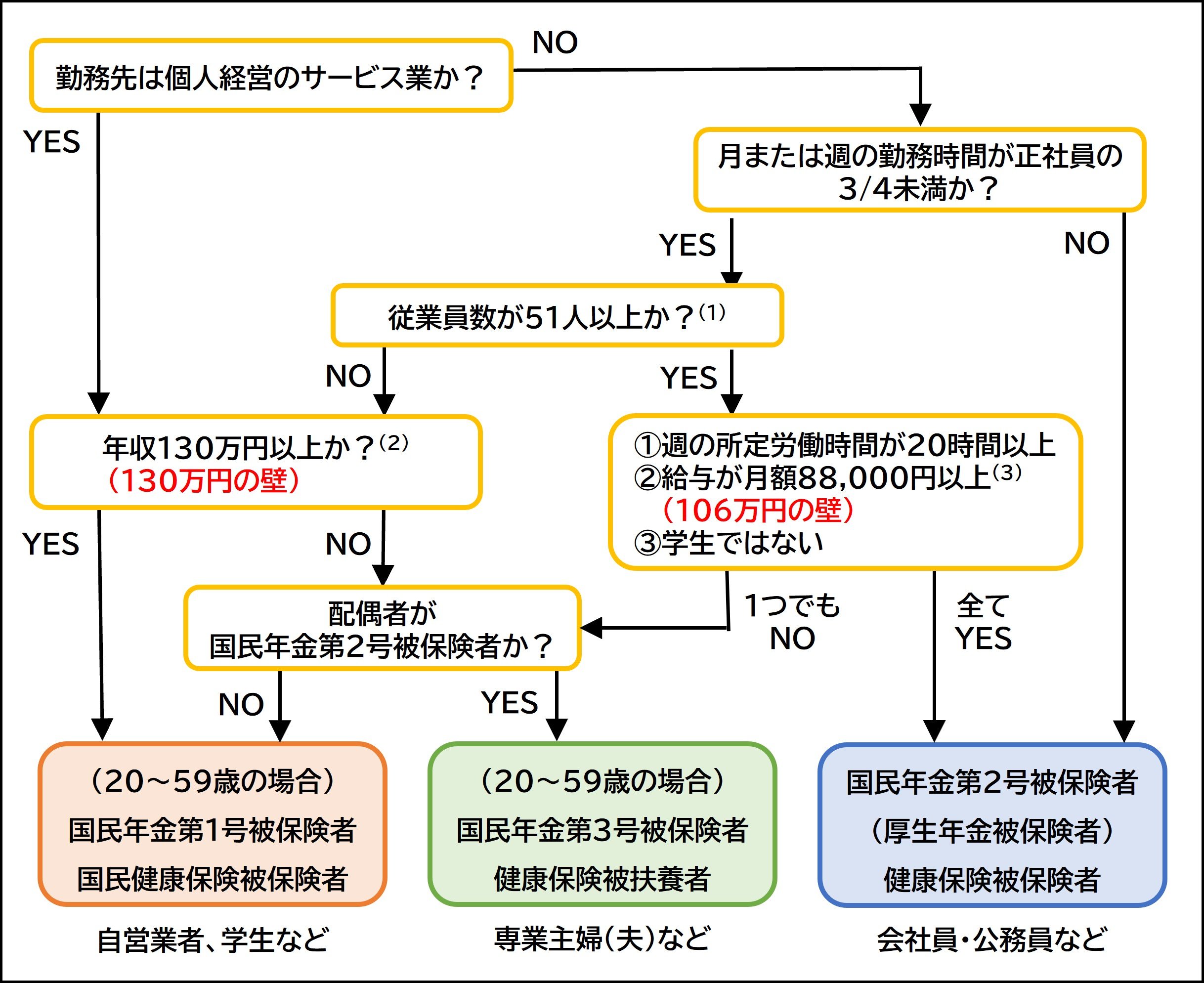 法人等に勤務している場合、勤務時間によって正社員と同等の働き方をしていれば、国民年金の第2号被保険者・健康保険の被保険者となります。3/4未満の勤務時間しか働いていないパートやアルバイトの場合でも、従業員が51人以上で、①週の勤務時間が20時間以上、②給与が月額88,000円以上、③学生ではないという条件にすべて当てはまれば、国民年金の第2号被保険者・健康保険の被保険者となります。