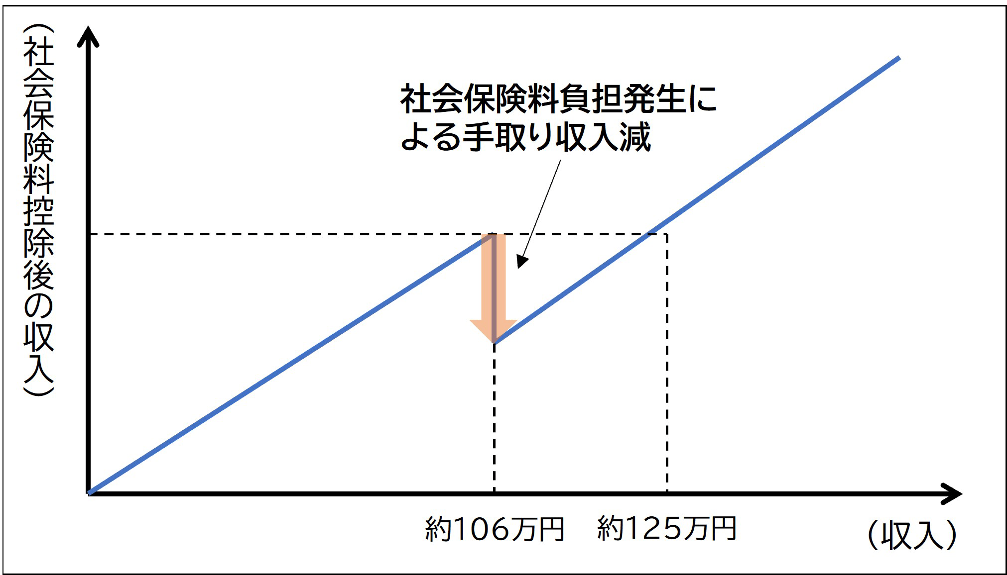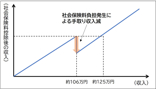 社会保険が適用されると、下図のように社会保険料負担額の分だけ手取り収入が減少することになります。