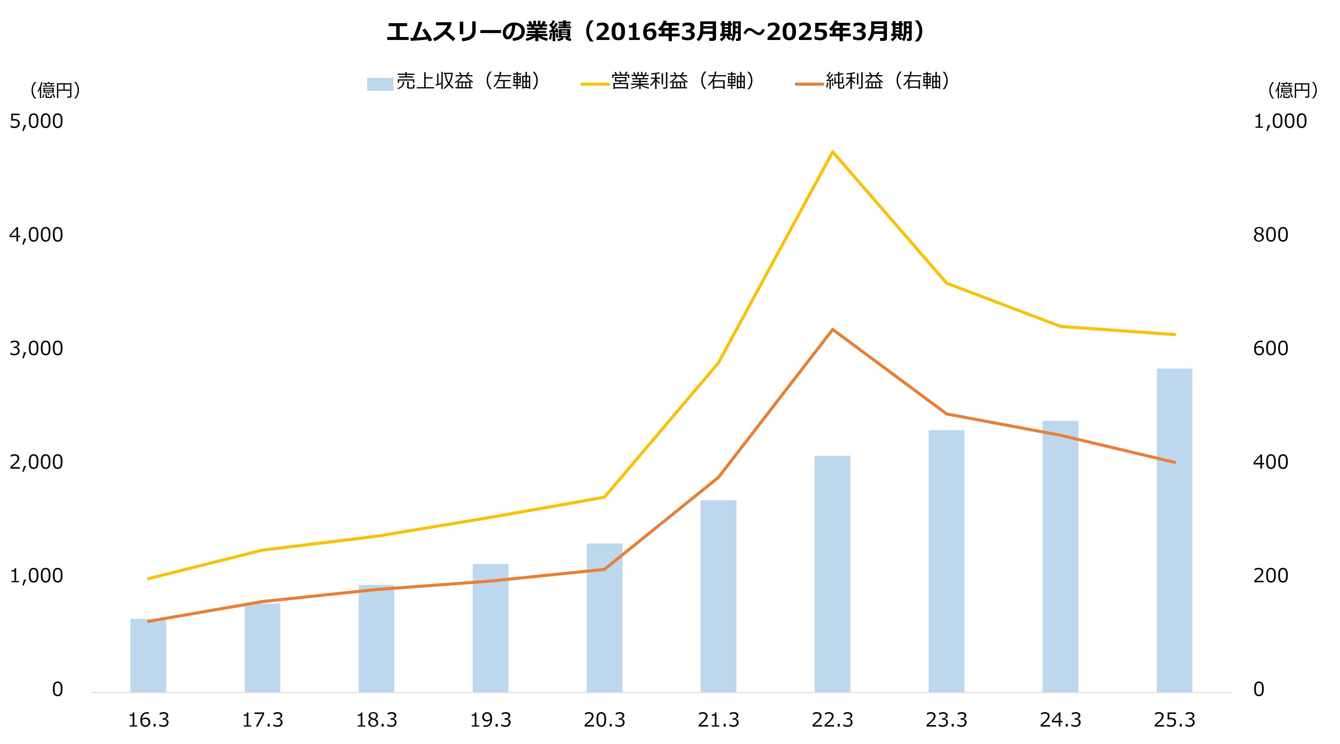 しかし、コロナが終息に向かうと関連の需要は減少し、エムスリーの成長は鈍化します。売り上げは増加トレンドを維持しますが、営業利益は25年3月期まで3期連続で減少しました。高く評価された株価は修正を迫られることととなり、長期の下落につながります。