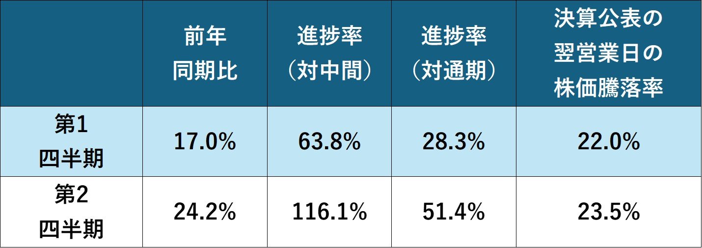 この見通しは、決算で徐々に株価に織り込まれている状況です。今期の業績予想は25年3月期の決算で初めて公表されましたが、公表翌営業日の株価は3.2%高にとどまりました。しかし、第1四半期および第2四半期の決算後にはいずれも同20%以上に急騰します。株式市場は当初は見通しに懐疑的で、進捗の確認後に株価を再評価している様子がうかがえます。