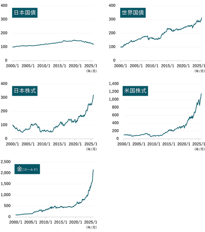 2000年1月末から2025年11月末までのデータを見ると、近年の金利上昇により下落している日本国債を除けば、いずれの資産も概ね上昇していることが分かります。また、日米株式や金(ゴールド)は、大幅な上昇をみせる時期があった一方、2000年代初頭のITバブル崩壊や2008年のリーマン・ショックのような大きな下落も経験し、立ち直るまでには数年を要したことも分かります。