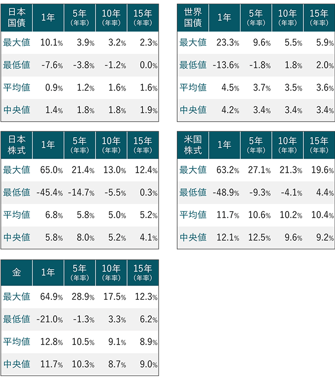 また、同じ期間における1年・5年・10年・15年の異なる保有期間のリターンを比較したのが、以下の表です。表からは、保有期間が短い場合は、投資結果の最大値と最小値の差が大きく、保有期間が長い場合は、平均値に近い結果が出やすくなっているが分かります。