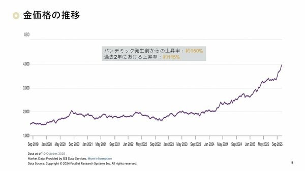 金価格の上昇が続いている。2010年代は1トロイオンスあたり1000米ドル台で推移していたが、2019年前後から価格が上がり続け、2025年10月にはついに4万ドルの大台を突破し、年初来で60%超もの価格上昇を遂げた。連日のように最高値更新の報道があり、金価格の動向を注視していた投資家も多いだろう。