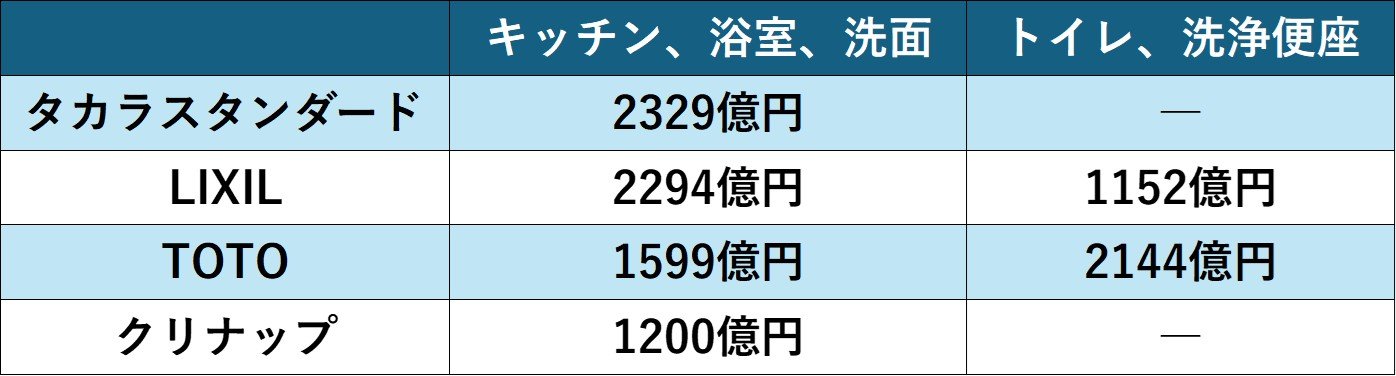 資本政策から離れ、業績にも目を向けましょう。タカラスタンダードは水回り製品のメーカーで、キッチンは国内首位、洗面化粧台および浴室は国内3位です。特に新築マンション向けに強く、キッチンと洗面化粧台はシェア7~8割と市場を圧倒しています。