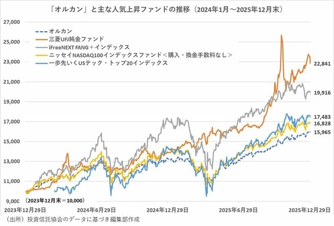 「オルカン」に代わって人気を高めたファンドは、「オルカン」と比較すると価格変動リスクが高いファンドになっている。たとえば、「三菱UFJ純金ファンド」は金価格に連動するファンドだが、数千の株式に分散して投資する「オルカン」と比較して「純金」の価格変動率は大きい。たとえば、2025年11月末時点の過去5年間のファンドのリスク(標準偏差)は、「オルカン」の年率13.32%に対して「三菱UFJ純金ファンド」は同17.00%だ。
