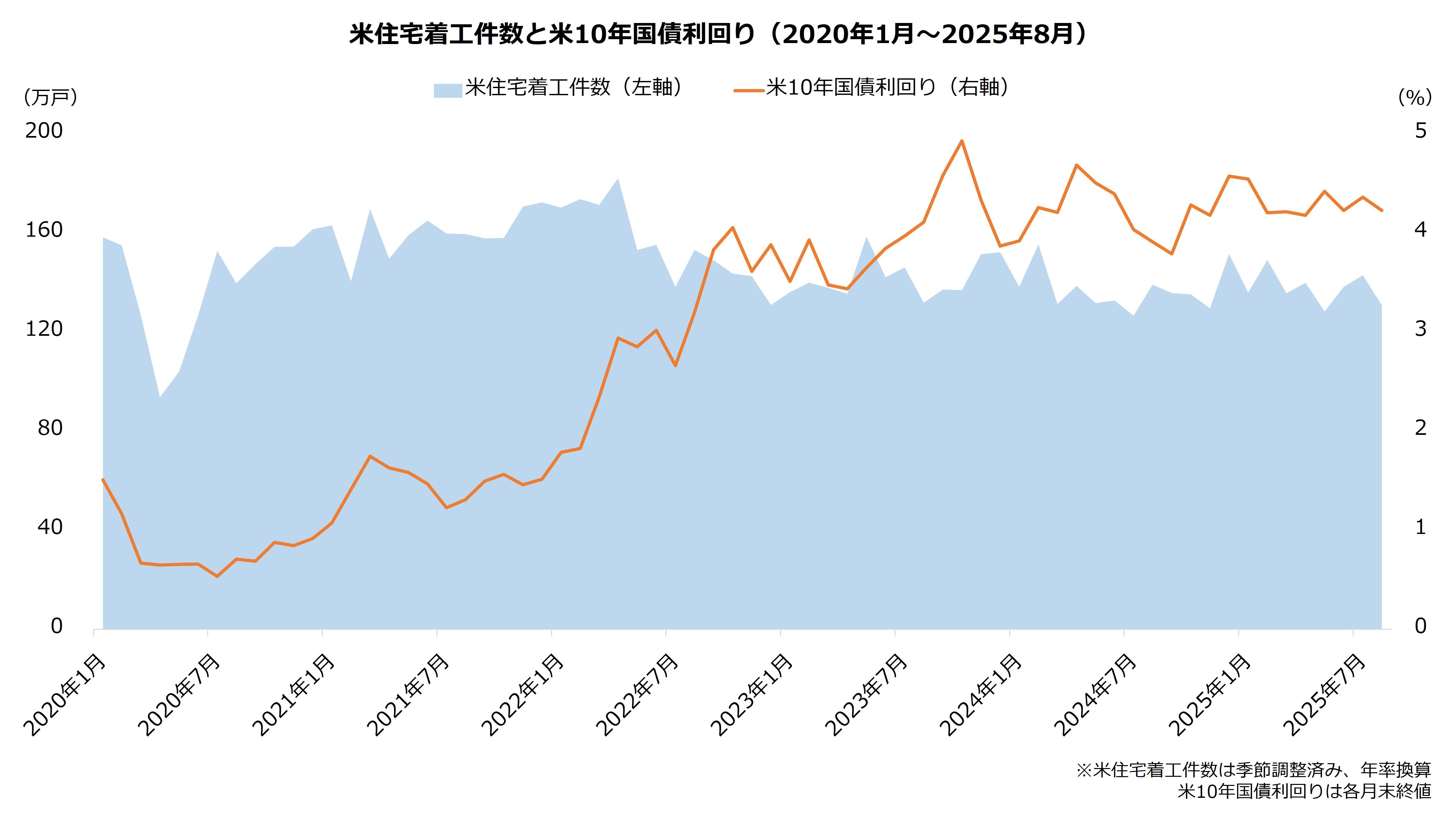 金利の上昇は一般にインフレを鎮静化させますが、住宅市場には逆風です。米住宅着工件数は、利上げを開始した22年以降で顕著に低迷しています。直近ピークの182.0万戸(22年4月)から、公表分で最新となる25年8月では130.7万戸まで減少しました(季節調整済み、年率換算)。