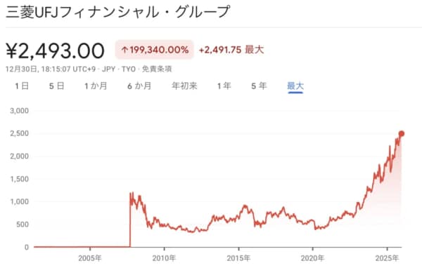 例えば、三菱UFJフィナンシャル・グループの株価チャートを見ると、長期間にわたって低迷した後、2020年以降の数年で急激に上昇しています。