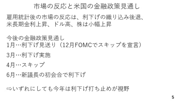 一方、経済が概ね底堅く推移する限り、4月も利下げは見送られるでしょう。6月のFOMCは新議長の下で開かれる初会合です。時期議長はトランプ大統領に就任後の利下げをおそらく約束したであろうと考えられます。就任直後の6月のFOMCでは利下げに踏み切るのではないでしょうか。