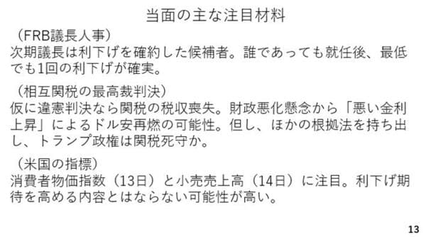 最後に当面の注目材料です。FRB議長人事、相互関税を巡る最高裁判決については昨年第63回でも取り上げたものです。その他では来週アメリカの消費者物価指数と小売売上高が注目されます。消費者物価指数は賃金の動きや足元の景況感などに照らし、大きくインフレ率が低下しているとは考えにくく、小売売上高も週次の民間データ同様、底堅さが確認できそうです。
