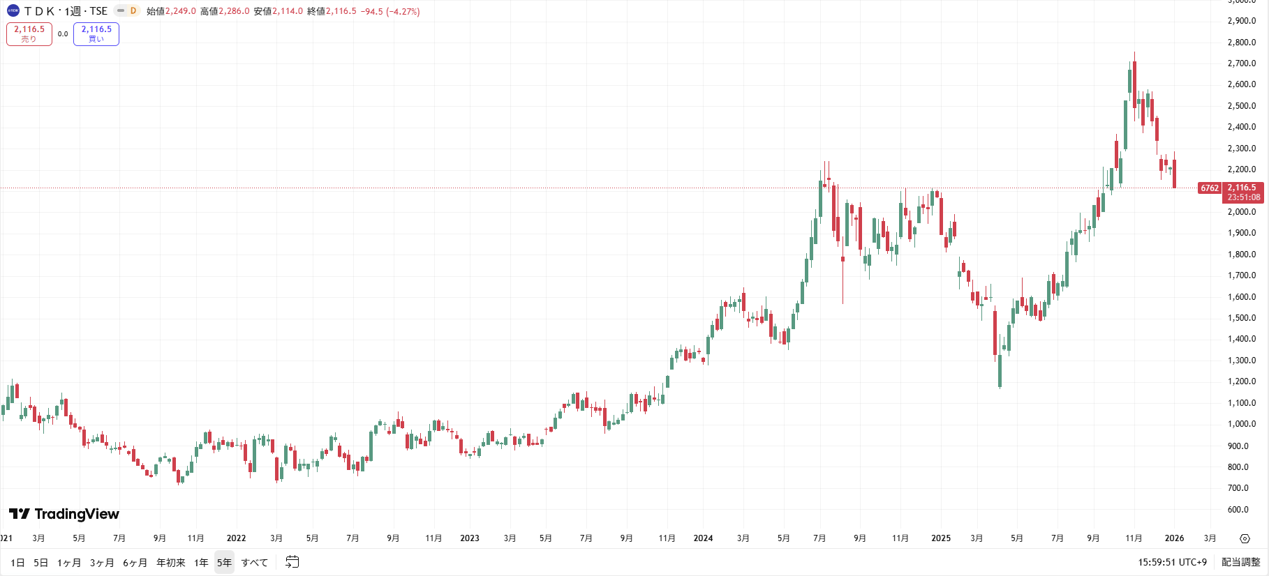 【TDKの株価チャート(過去5年間)】