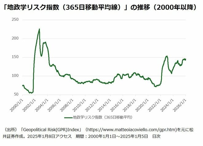 同指数は新聞記事をベースに算出したものであるため、日次でみると「一時的な騒ぎ」といったノイズが入り込む。移動平均を長くとってみると、浮き彫りになる傾向があるかもしれない。そこで、GPR指数の365日(1年)移動平均線を2000年以降でみてみた。