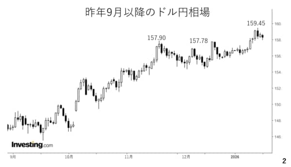 昨年9月以降、高市内閣の誕生前後で円安、株高、長期金利の上昇が続きました。昨年は158円を手前に上昇を阻まれましたが、先週発表された12月の米雇用統計が予想を上回った結果、ドル買いが優勢となり、158円台を回復。