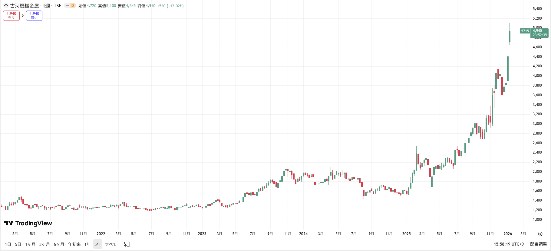 【古河機械金属の株価チャート(過去5年間)】