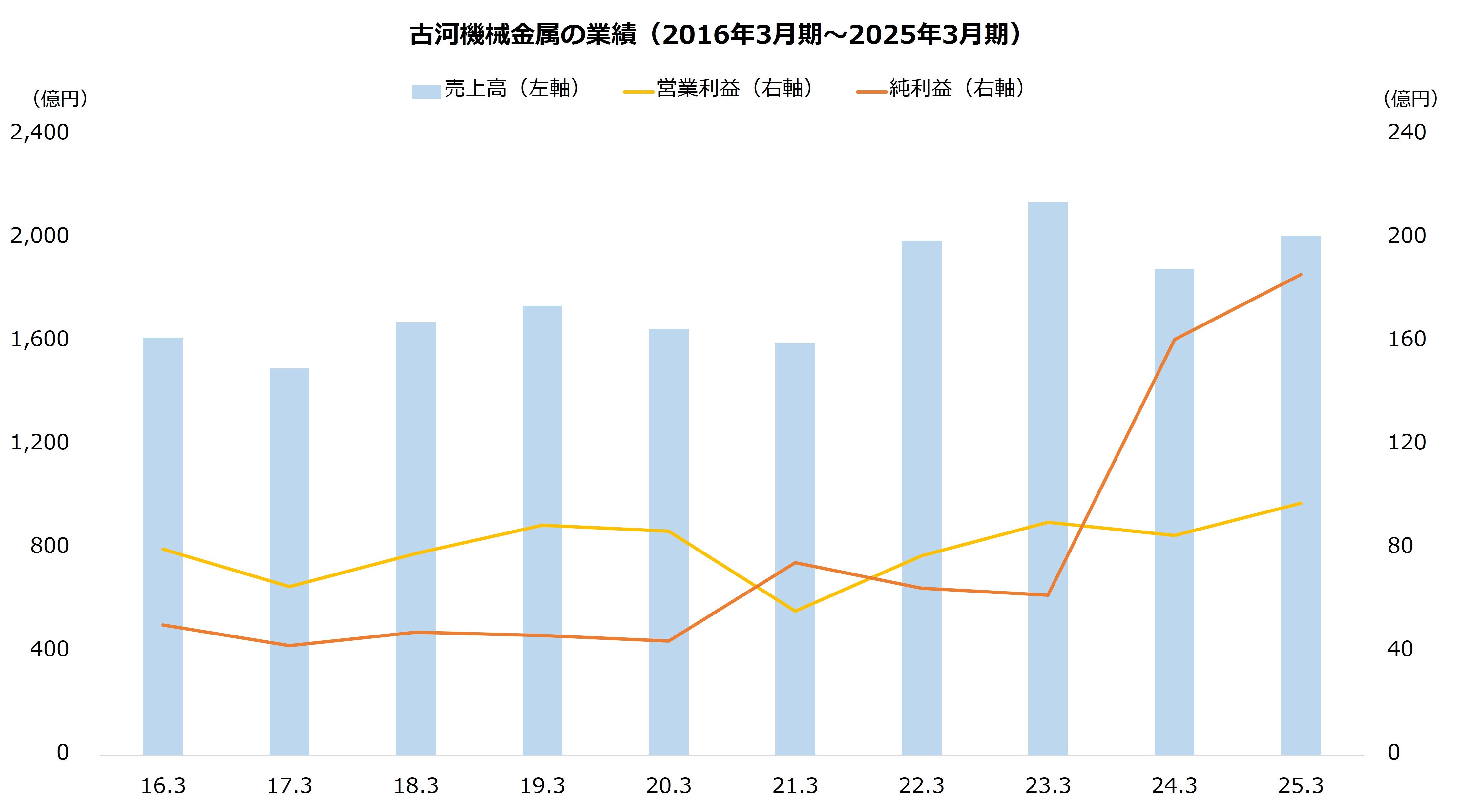この改善に向け古河機械金属は24年5月、政策保有株式を純資産比で20%未満まで削減する方針を設定しました。削減は迅速に進められ、純資産比は24年3月末の40.8%から1年で16.6%まで急減します。この影響もあり、古河機械金属の純利益は大きく増加しました。なお、24年3月期の大幅な最終増益は不動産の売却益が主因です。