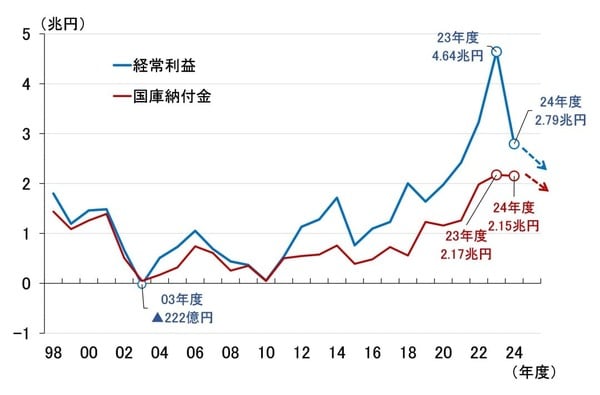 ここで、2024年度の経常利益が前年度から大幅減となっていることに気付かれた読者が多いのではないでしょうか。以下では、それがなぜか、そして2025年度はその傾向がもっと強くなることを解説しましょう。