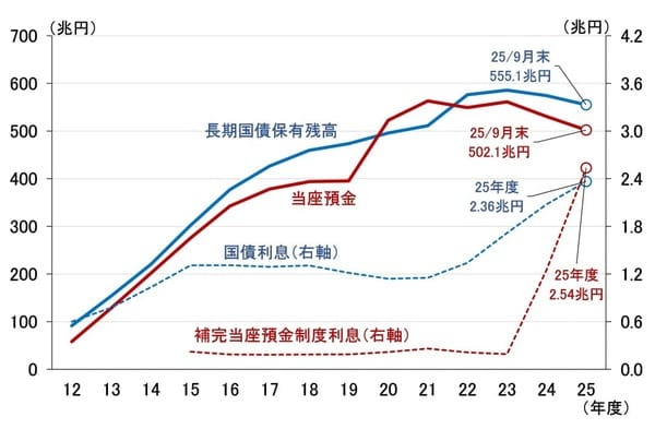 日銀は2024年3月にマイナス金利政策を解除し、同年7月と2025年1月に利上げを実施しました。それに伴い付利も引き上げられ、その結果利払いが膨らみ、それが経費として計上される「補完当座預金制度利息」を押し上げたというわけです。実際の額は、2023年度が0.19兆円、2024年度が1.25兆円であり、1兆円超の増加となっています。