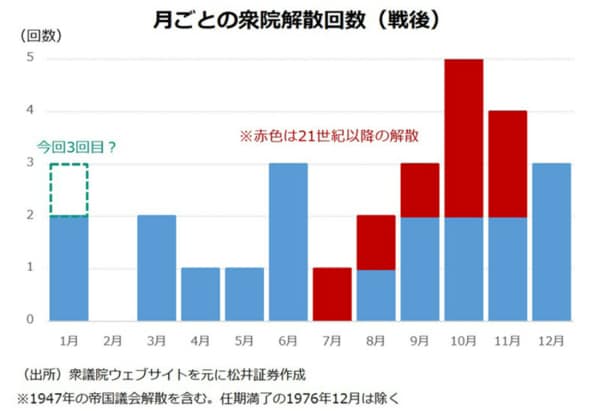 足元の政局に話を移そう。今回、2つのサプライズがあった。1つ目は「経済最優先」として、解散の可能性を否定していた高市首相が、通常国会冒頭という、極めて挑戦的な時期での解散を打ち出したことである。過去において、1月の解散は1955年の鳩山一郎内閣と、1990年の海部俊樹内閣の時の2回だけだ。21世紀以降でみれば、次年度予算が成立し、政府が「経済財政運営と改革の基本方針」(骨太の方針)をまとめた後の時期である年後半にすべての解散が集中している。