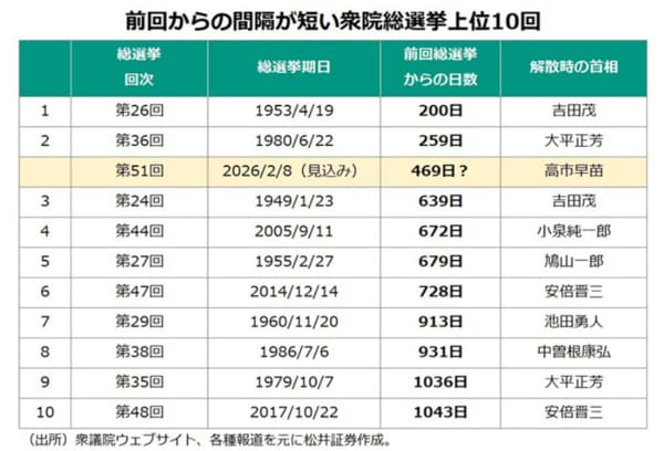 今回の政局で筆者が気になるのが、前回衆院総選挙からの期間の短さだ。2024年10月27日からわずか1年3カ月程度での総選挙となる見込みで、前回総選挙との間隔は歴代で3番目の短さとなる。ちなみに、最も短い、1953年4月、2番目に短い1980年6月の総選挙は、それぞれ日本政治の歴史に名を残す「バカヤロー解散(吉田茂内閣)」、「ハプニング解散(大平正芳内閣)」に伴うものだ。いずれも内閣不信任決議の可決を経た解散(いわゆる69条解散)であり、日本国憲法の素直な解釈によるものである。