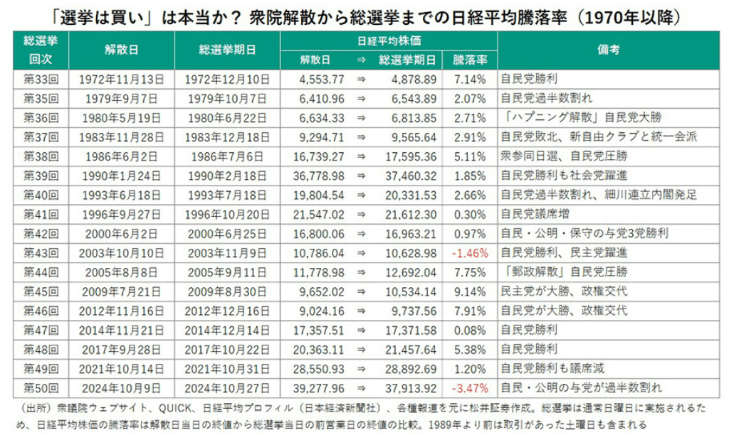 下の表は衆院解散から総選挙にかけての日経平均株価の騰落率をまとめたものだ。1970年以降、衆院解散によって生じた総選挙は17回。そのうち、9割近くの15回は解散から総選挙までの間、日経平均は上昇している。「選挙は買い」のアノマリーはある程度、説得力を持つようにも思えてくる。