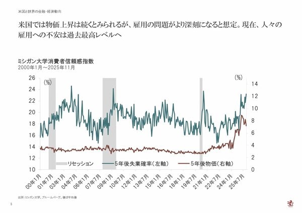 5年後の物価上昇率の予想を見ると、下がってはいるもののまだ高い水準です。その一方、過去最高値に近い水準をつけているのが雇用のセンチメントです。5年後に自分が失業しているかどうかに関する質問に対して、心配をしている方が多くいます。つまり、雇用の方が国民のマインドに大きく影響を与えているのではないかという仮説です。