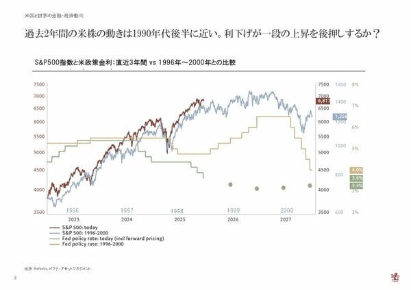 しかし、1990年代後半はITバブルの崩壊という結果を招きました。今回の局面に対してもAIバブル懸念はありますが、トランプ政権によるFRBへの影響力の行使や雇用に陰りが見えることで利下げに向かっているという点は異なります。今年の株価のメインシナリオとしては、マクロベースに従った米国株の上昇率は15%前後と見ております。