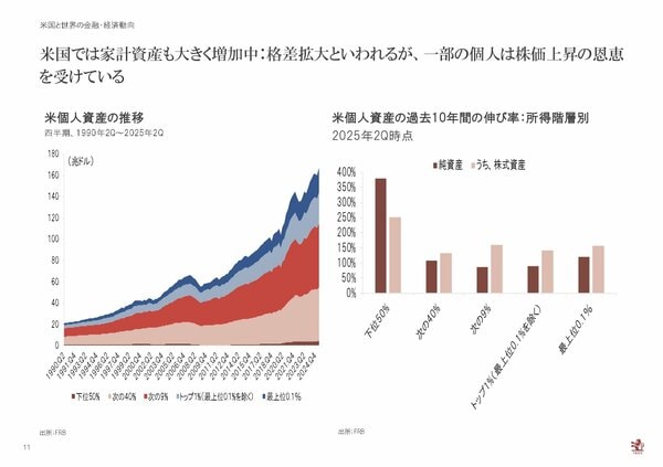 こうした各種の取り組みもあって米国の個人資産は増えており、所得ベース別の個人資産の推移をみると所得が下位50%の中低所得者層が実は最も資産が増えているのです(図3)。米国は資産効果が顕著ですから、これらを踏まえると米国は順調というのがメインシナリオです。