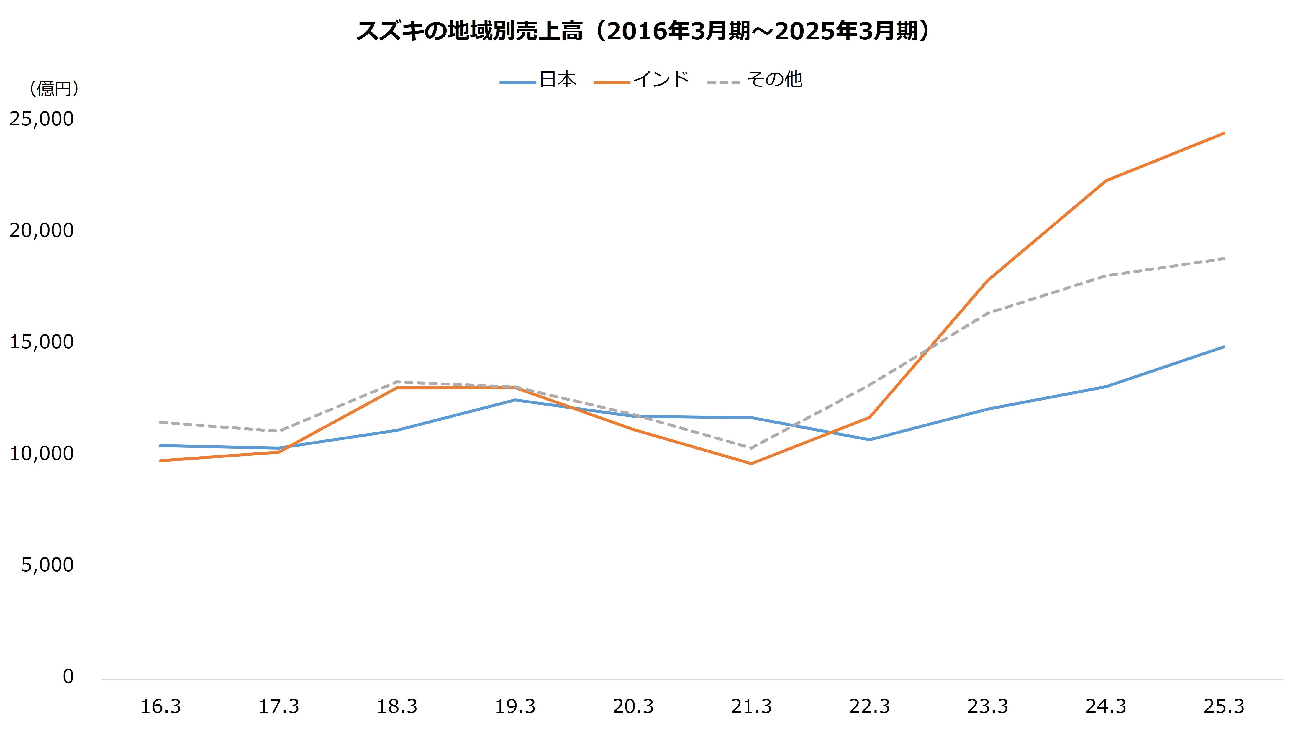 同業を圧倒する成長率は市場の違いに起因します。主要な自動車メーカーが中国や北米に注力する一方、スズキは主にインドを中心としたアジアへ展開しています。