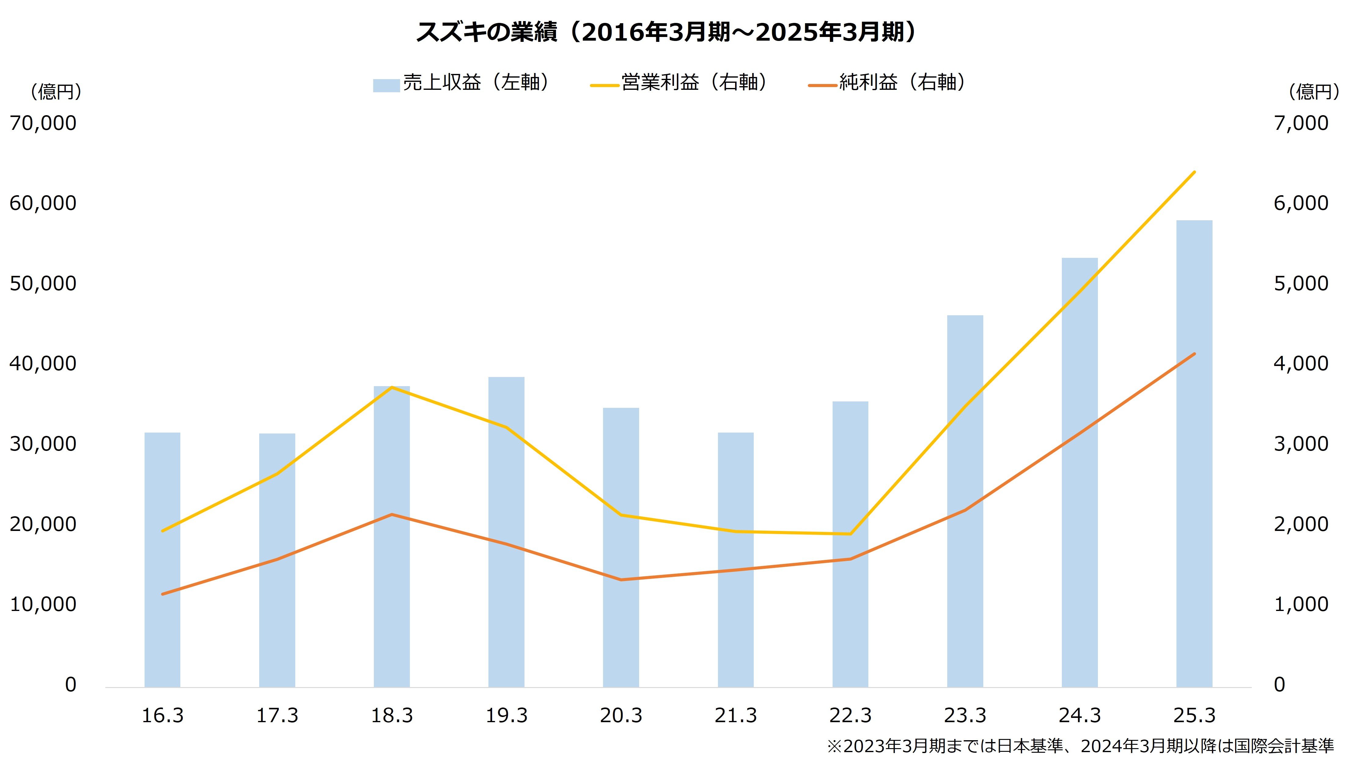 スズキの好評価は高い成長性が背景にあると考えられます。同社の営業利益は25年3月期までの3年間で3.4倍に拡大しました。成長率はトヨタ自動車(同+60.1%)や本田技研工業(同+39.3%)を大幅に上回ります。