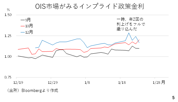 加えて、今週は利上げの織り込みも進展しました。今年12月時点における市場が織り込む政策金利は一時1.25%を超えました。つまり、年2回の利上げを完全に織り込んだ状態です。週末にかけて織り込みがやや剥落しましたが、インフレ高進を念頭に、市場が日銀の利上げ加速を想定したのかもしれません(5ページ)。