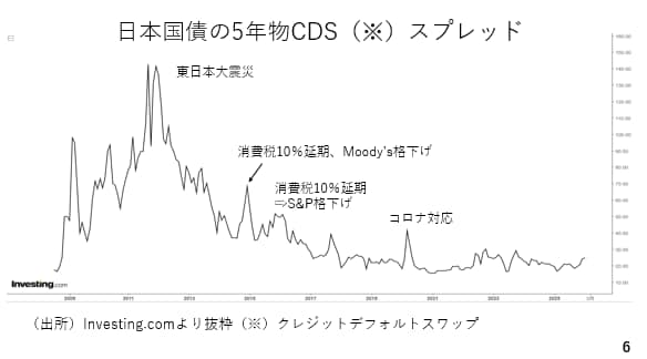 過去を振り返りますと東日本大震災の後でスプレッドが急上昇しています。そのほか消費税の税率引き上げの延期や欧米格付け機関による格下げ、コロナ禍における大規模な財政出動の際にもスプレッドが拡大しています。一方、足元でスプレッドは概ね横ばいで推移しています。こうして見ますと日本政府の財政懸念ばかりが長期金利を押し上げているわけではないようです(6ページ)。