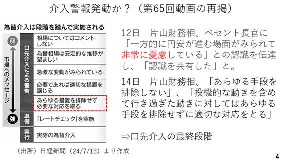 第65回の動画でも紹介した通り、実際の介入に至るまでにいくつかの段階があります。その点、先週の時点で片山財務大臣は「投機的な動きに対してあらゆる手段を排除しない」と発言しており、口先介入が最終段階にあったことが示唆されていました。