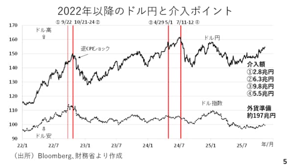 これまで大きく分けると➀2022年9月22日、➁同年10月21日と24日、➂2024年4月~5月、➃2024年7月と大きくわけて4回にわたり介入が実施されました。また、円買い介入の規模は、➀から順に、約2.8兆円、約6.3兆円、約9.8兆円、約5.5兆円です。介入後のドル円をみますと、➀と➂の介入後もドル高円安が進んでいます。
