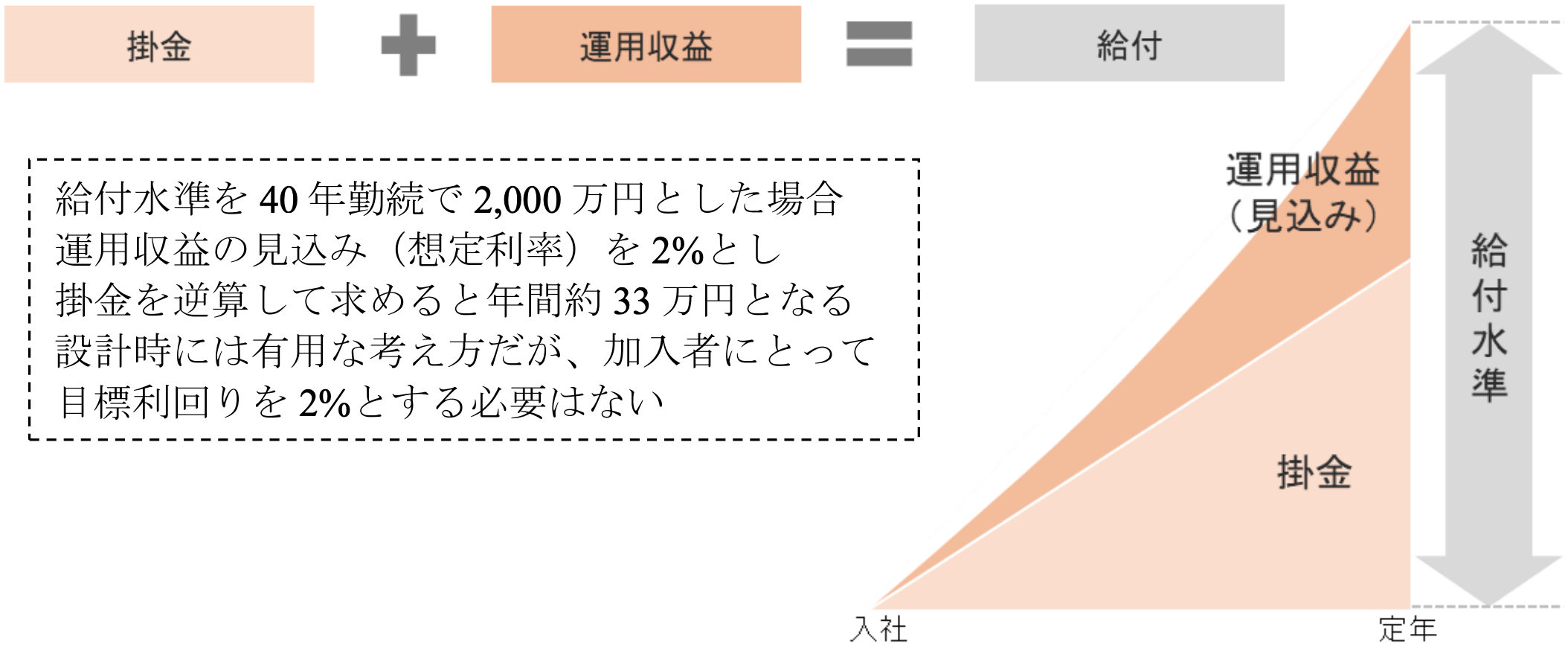 DCが従来の退職給付の代替制度として機能するために持ち入れられた概念が「想定利率」である。移行前の退職給付と同等の給付額を想定し、移行後のDCの掛金水準を設計する際に、どの程度の運用収益を見込むかの前提として設定される利率である。例えば、移行前のDBが40年勤続で2,000万円の給付が標準の場合、単純に2,000万円を40年で除し年50万円の掛金としても良い。しかし運用収益を前提とするならば、50万円は事業主にとって高コストに見える。このため、期待収益率(想定利率)を置いたうえで、労使で掛金水準を決める。一般に、事業主は高い利率を、加入者は低い利率を望む傾向があるが、資産運用リスクを加入者が負担することへの配慮から、1〜2%程度の低めの利率が採用されることが多い。ちなみに想定利率2%であれば、前述モデルの掛金は年約33万円となる。